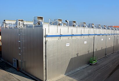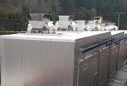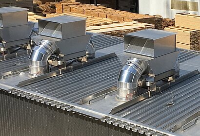 Hohe Zwischendecken, stehende Heizregister, optimierte Ventilatoraufteilung und strömungsoptimierte Luftumlenkräume sorgen für eine gleichmäßige Anströmung aller Holzstapel, wodurch beste und gleichmäßige Trocknungsergebnisse erzielt werden.